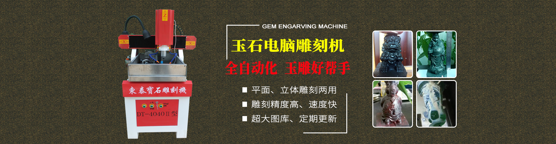 東泰生產出的寶石機械設備可用于加工晶體雜石、瑪瑙玉石、人造石、其他石類及貝殼、骨頭化石等等,加工出的產品孔位精確、損耗小、速度快、效率高;雕刻品細致、精美,大大降低了成本,提高了效率,深受寶石行業(yè)商家的歡迎。